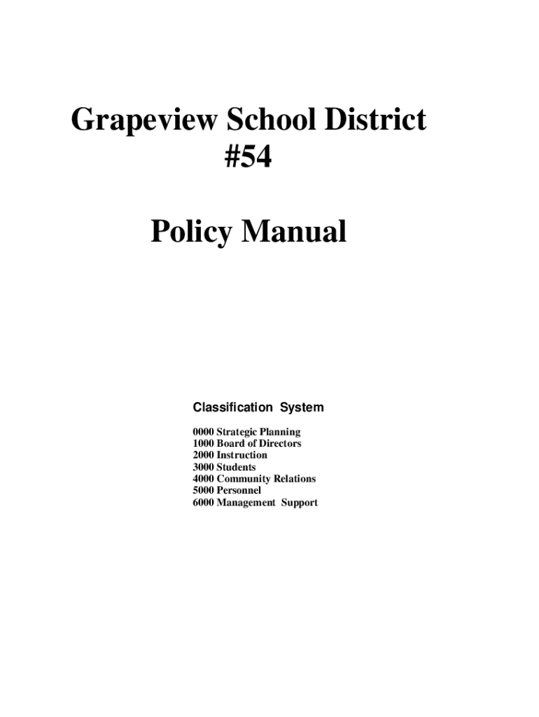 Grapeview School District #54 Policy ManualClassification System 0000 Strategic Planning 1000 Board of Directors 2000 Instruction 3000 Students 4000 Community Relations 5000 Personnel 6000 Management