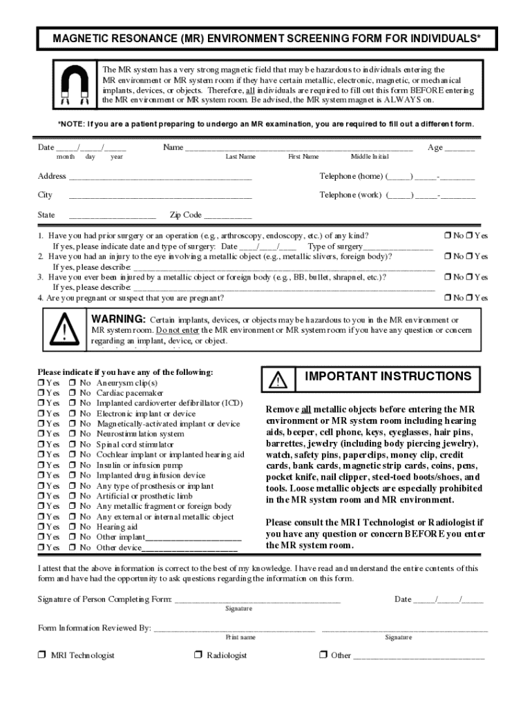 Get the free i magnetic resonance (mr) environment screening form for ...