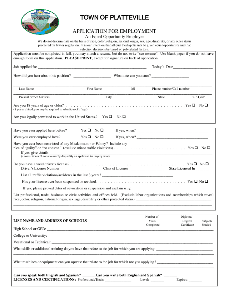 Get the free application for employment city of platteville