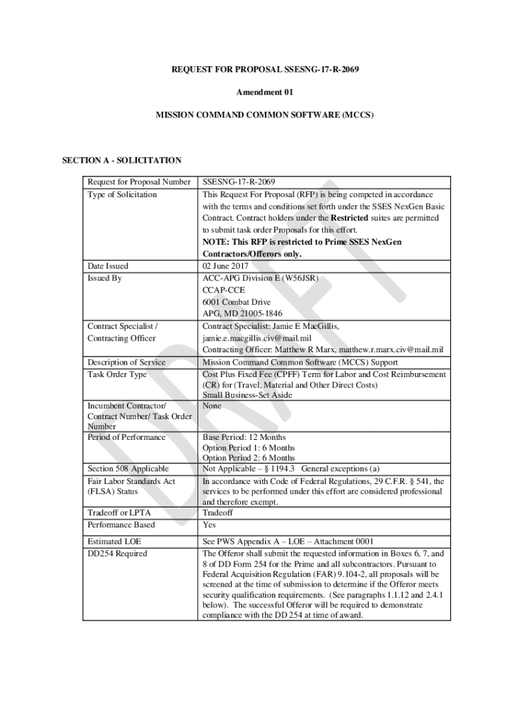 REQUEST FOR PROPOSAL SSESNG17R2069 Amendment 01 MISSION COMMAND COMMON SOFTWARE (MCCS)SECTION A SOLICITATION Request for Proposal Number Type of SolicitationDate Issued Issued ByContract Specialist / Contracting Officer Description of Service Task Order TypeIncumbent Contractor/ Contract Number/ Task Order Number Period of PerformanceSection 508 Applicable Fair Labor Standards Act (FLSA) Status Tradeoff or LPTA Performance Based Estimated LOE DD254 RequiredSSESNG17R2069 This Request
