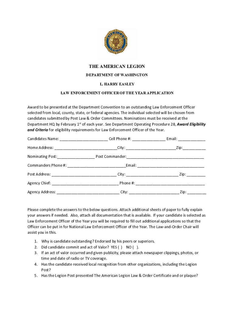 THE AMERICAN LEGION DEPARTMENT OF WASHINGTON L. HARRY EASLEY LAW ENFORCEMENT OFFICER OF THE YEAR APPLICATIONAward to be presented at the Department Convention to an outstanding Law Enforcement Officer