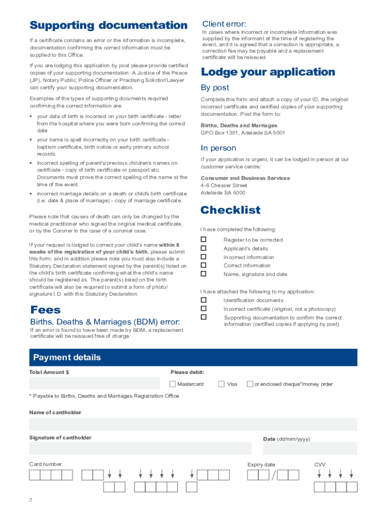 Consumer and Business ServicesApplication to correct an entry Births, Deaths and Marriages This application form can be used to correct information in the Register held by the Births, Deaths and Marriages