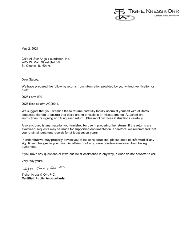 May 2, 2024 Cal\'s AllStar Angel Foundation, Inc. 2422 W. Main Street Unit 3B St. Charles, IL 60175Dear Stacey: We have prepared the following returns from information provided by you without verification or audit: 2023 Form 990 2023 Illinois Form AG990IL We suggest that you examine these returns carefully to fully acquaint yourself with all items contained therein to ensure that there are no omissions or misstatements. Attached are instructions for signing and filing each return. Please...