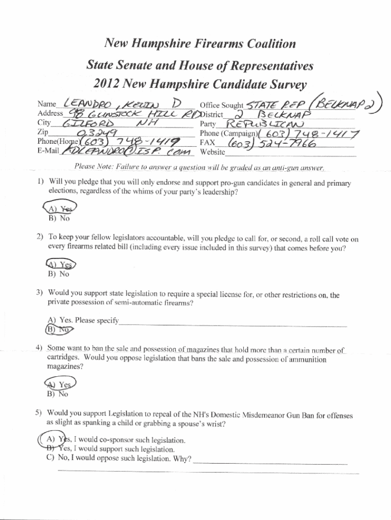 New Hampshire Firearms Coslition State Senate and House of Representatives2012 New Hampshire Candidate Survey Name/.genOffice SoughtAddressCityzip FAX EMailWebsite Please Note; luilure to answer a questionl)willbe gruded as an untigun answer.Will you pledge that you will only endorse and support progun candidates in general and primary elections, regardless of the whims of your party\'s leadership?@ B) No2)To keep your fellow legislators accountable, will you pledge