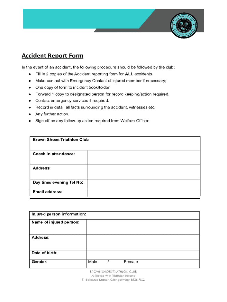 Accident Report Form In the event of an accident, the following procedure should be followed by the club: Fill in 2 copies of the Accident reporting form for ALL accidents.Make contact with Emergency