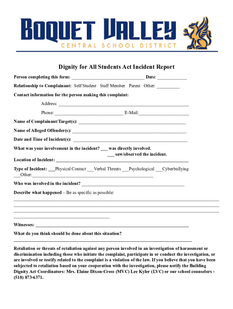 Dignity for All Students Act Incident Report Person completing this form: ___ Date: ___ Relationship to Complainant: Self/Student Staff Member Parent Other: ___ Contact information for the person making this complaint: Address: ___ Phone: ___ EMail:___ Name of Complainant/Target(s): ___ Name of Alleged Offender(s): ___ Date and Time of Incident(s): ___ What was your involvement in the incident? ___ was directly involved. ___ saw/observed the incident. Location of Incident: ___ Type of Incident: