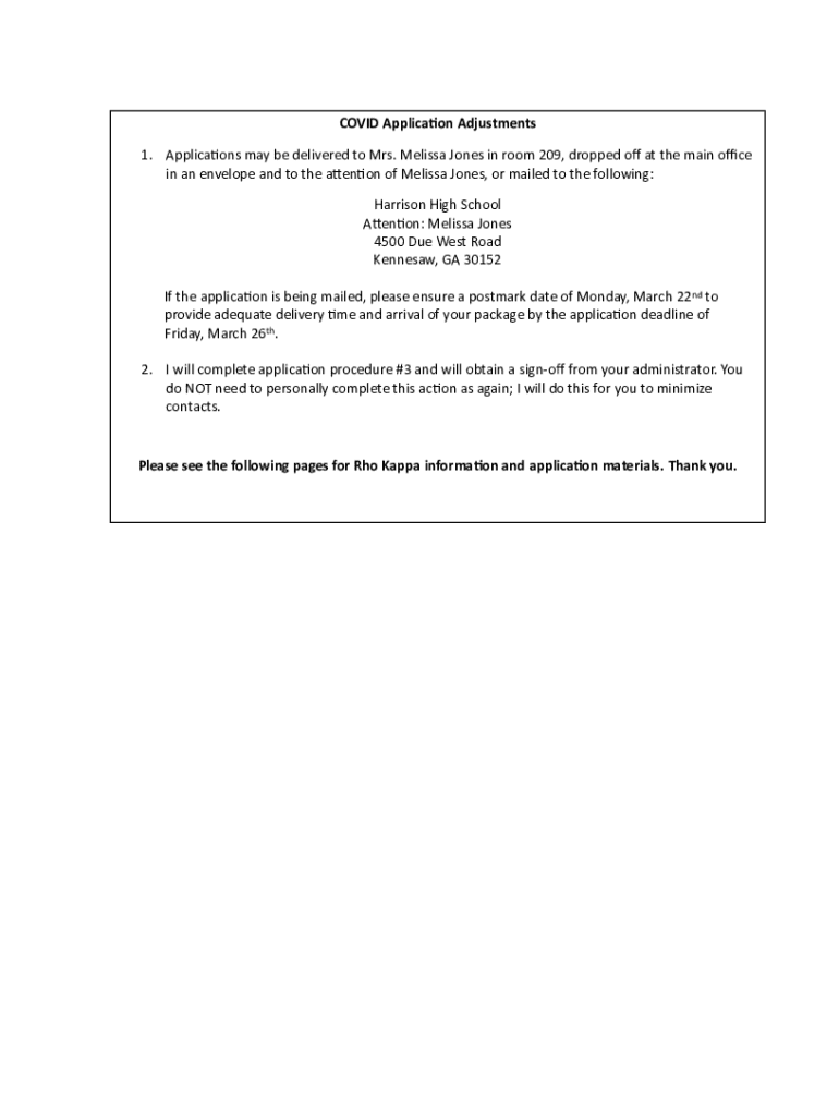COVID Applicaon Adjustments 1. Applica*ons may be delivered to Mrs. Melissa Jones in room 209, dropped o at the main oce in an envelope and to the a?en*on of Melissa Jones, or mailed to the following: Harrison High School A?en*on: Melissa Jones 4500 Due West Road Kennesaw, GA 30152 If the applica*on is being mailed, please ensure a postmark date of Monday, March 22nd to provide adequate delivery *me and arrival of your package by the applica*on deadline of Friday, March 26th. 2. I will complete