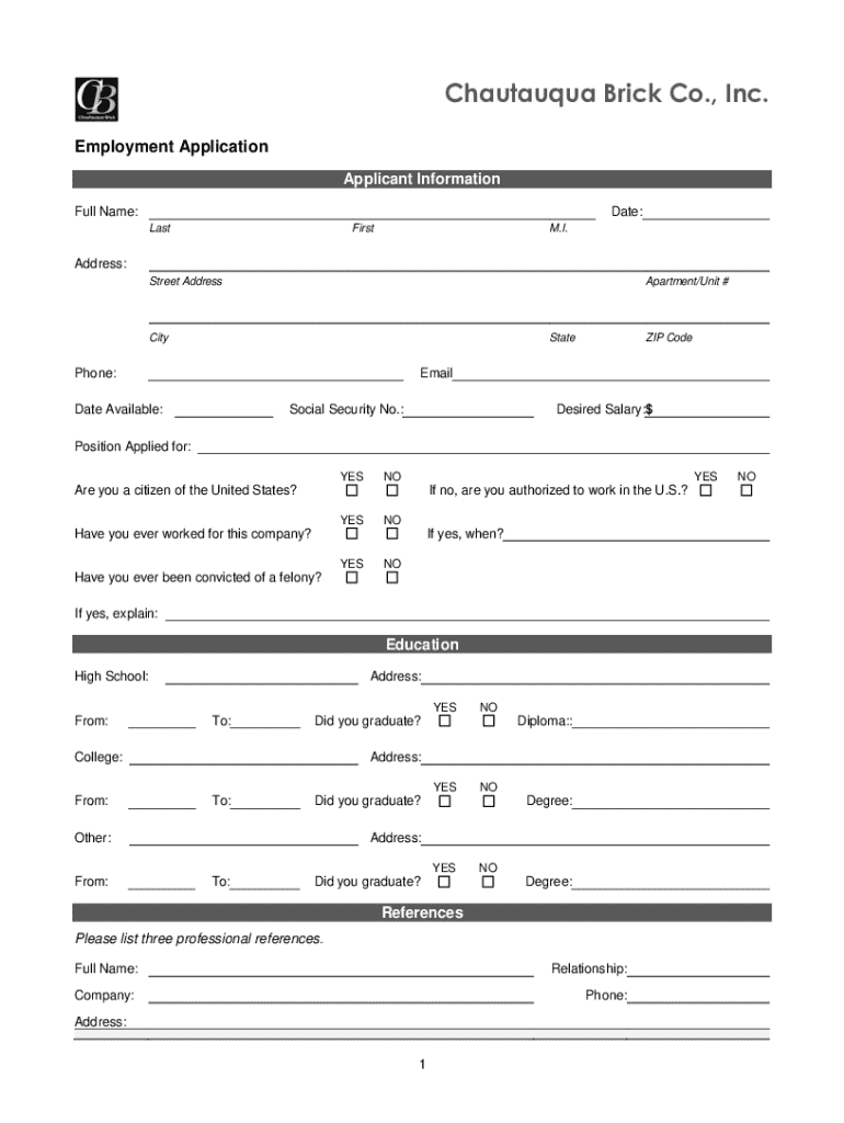 Get the free Employment application - Chautauqua Brick Co., Inc.