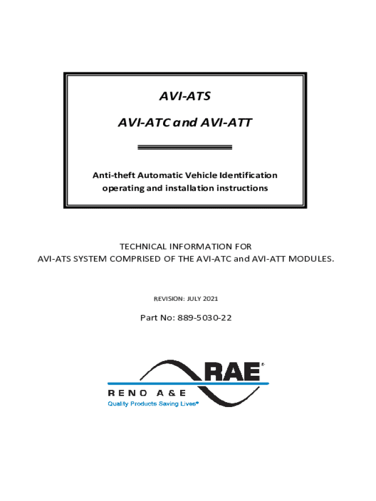 AVIATS AVIATC and AVIATTAntitheft Automatic Vehicle Identification operating and installation instructionsTECHNICAL INFORMATION FOR AVIATS SYSTEM COMPRISED OF THE AVIATC and AVIATT MODULES.REVISION: JULY 2021Part No: 889503022Reno A&E, Eberle Design Inc. 3510 E Atlanta Avenue, Phoenix, AZ 85040 USA Telephone: +1.480.968.6407, Fax: +1.602.437.1996 Website: www.editraffic.com Email: sales@editraffic.com6.6 Ft. (2 m)6.6 Ft. (2 m)AVIATC.AVIATT. 6.6 Ft. (2 m)Ver.: 1.0