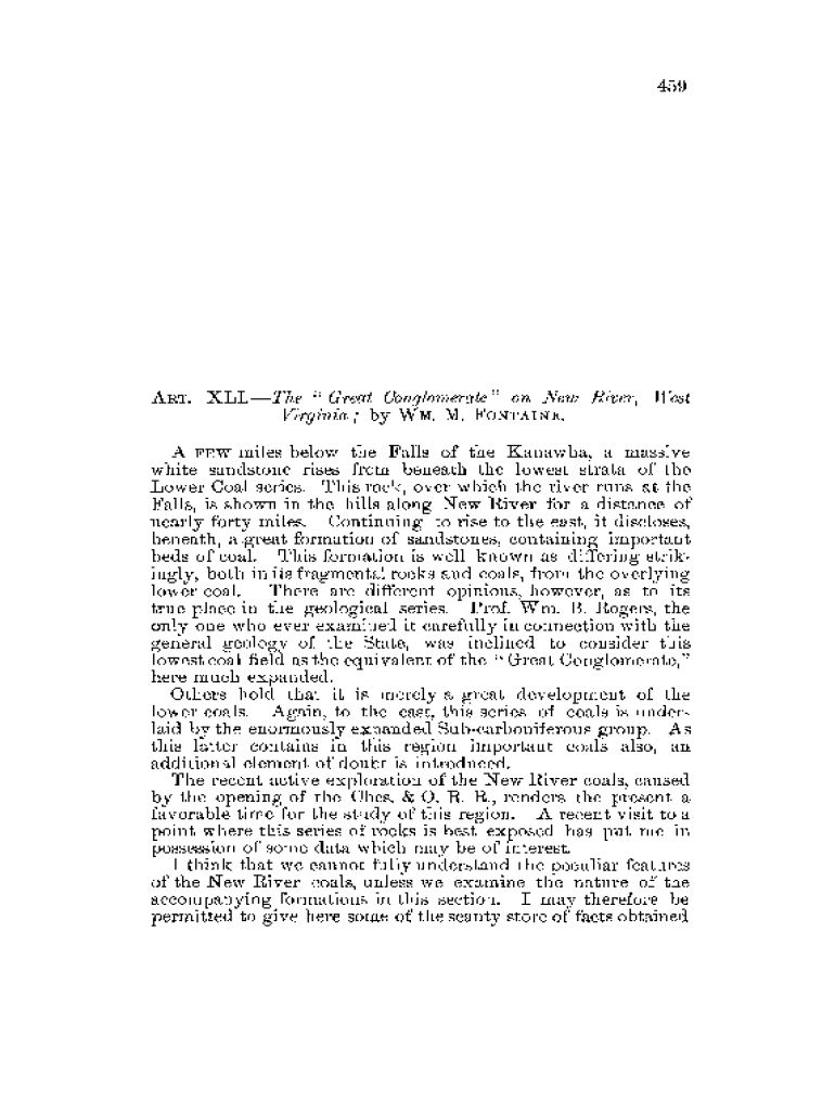 459ART.XLI.The \"Great Conglomerate\" on New River, lVest Virginia; by WM. M. FONTAINE.A FEW miles below the Falls of the Kanawha, a massive white sandstone rises from beneath the lowest strata of