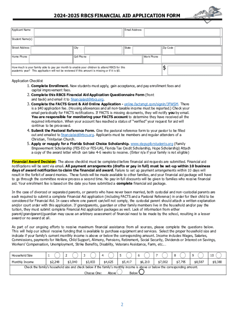 20242025 Financial Aid Information & Application The mission of RBCS includes assisting parents in carrying out their Godgiven responsibility to guide their children to Christian maturity in accordance with biblical principles. Our desire for the RBCS financial aid program is to be able to provide Christian families a quality Christian education. All financial aid comes from tuition paid for by parents or donors. The Financial Aid process may take 26 weeks to complete after all required...