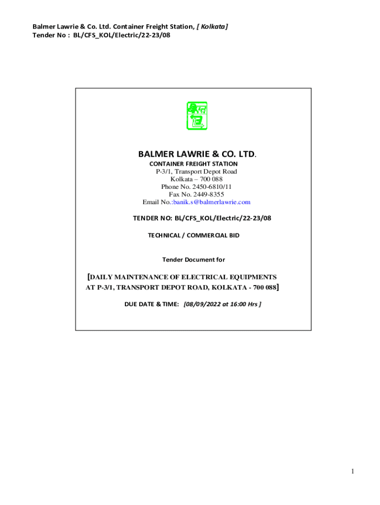 Balmer Lawrie & Co. Ltd. Container Freight Station, [ Kolkata] Tender No : BL/CFS_KOL/Electric/2223/08BALMER LAWRIE & CO. LTD. CONTAINER FREIGHT STATION P3/1, Transport Depot Road Kolkata 700 088