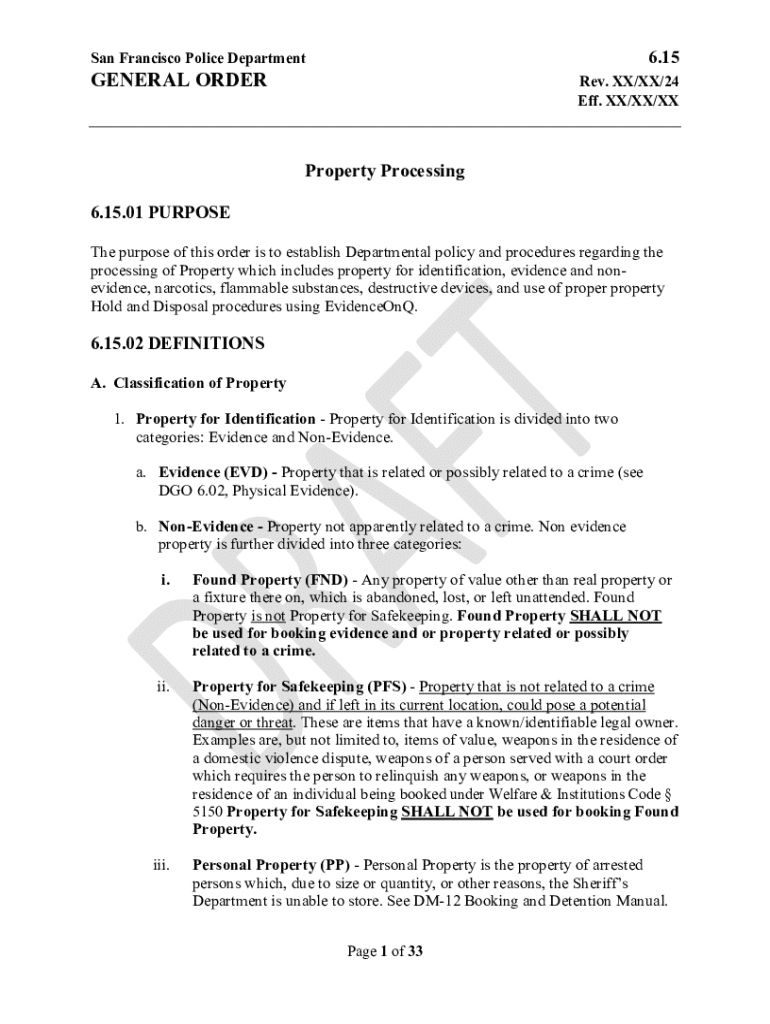 6.15San Francisco Police DepartmentGENERAL ORDERRev. XX/XX/24 Eff. XX/XX/XXProperty Processing 6.15.01 PURPOSE The purpose of this order is to establish Departmental policy and procedures regarding the processing of Property which includes property for identification, evidence and nonevidence, narcotics, flammable substances, destructive devices, and use of proper property Hold and Disposal procedures using EvidenceOnQ.6.15.02 DEFINITIONS A. Classification of Property 1. Property for...