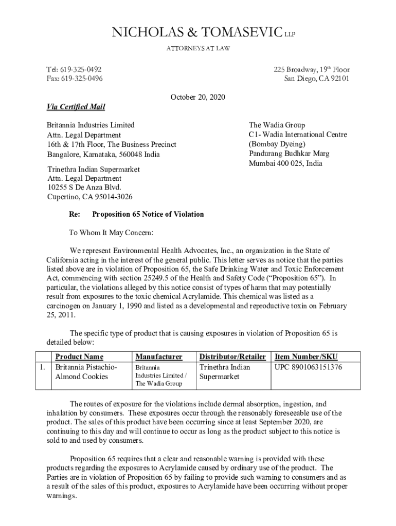 October 20, 2020Via Certified Mail Britannia Industries Limited