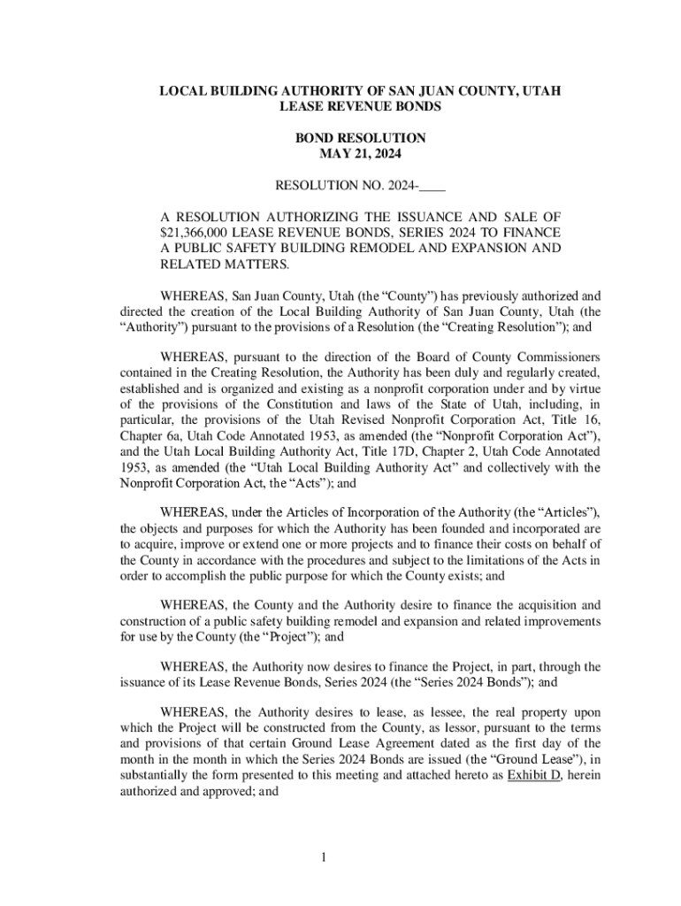 LOCAL BUILDING AUTHORITY OF SAN JUAN COUNTY, UTAH LEASE REVENUE BONDS BOND RESOLUTION MAY 21, 2024 RESOLUTION NO. 2024___ A RESOLUTION AUTHORIZING THE ISSUANCE AND SALE OF $21,366,000 LEASE REVENUE