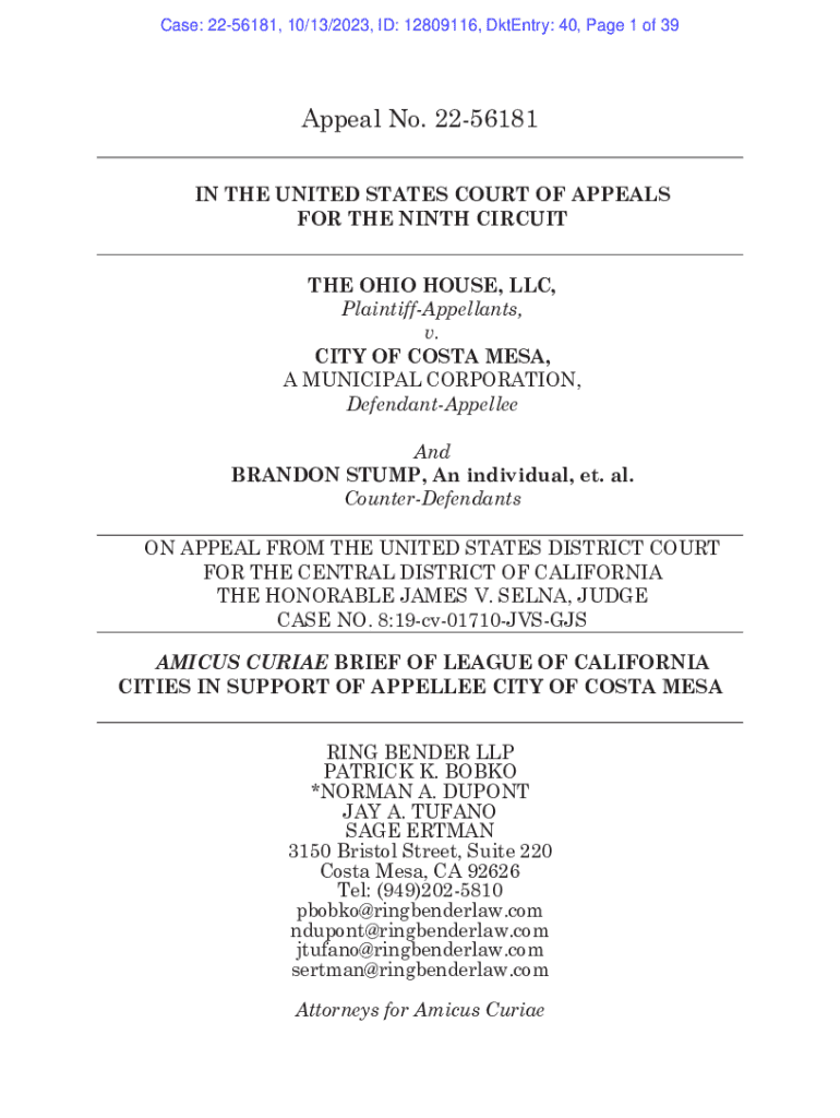 Case: 2256181, 10/13/2023, ID: 12809116, Entry: 40, Page 1 of 39Appeal No. 2256181 IN THE UNITED STATES COURT OF APPEALS FOR THE NINTH CIRCUIT THE OHIO HOUSE, LLC, PlaintiffAppellants, v. CITY OF