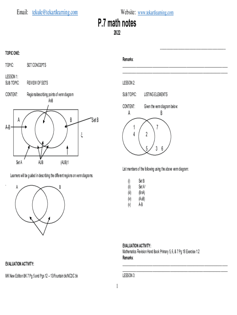 Email: tekule@tekartlearning.comWebsite: www.tekartlearning.comP.7 math notes 2022___ TOPIC ONE: TOPIC:SET CONCEPTSLESSON 1: SUB TOPIC:Remarks: ___ ___REVIEW OF SETSLESSON 2:Regions/describing points of venn diagram AnBSUB TOPIC:LISTING ELEMENTSCONTENT:Given the venn diagram below:CONTENT:ABABASet BB1 42 5Set AAUB7 36(AUB)1 List members of the following using the above venn diagram:Learners will be guided in describing the different regions on venn diagrams