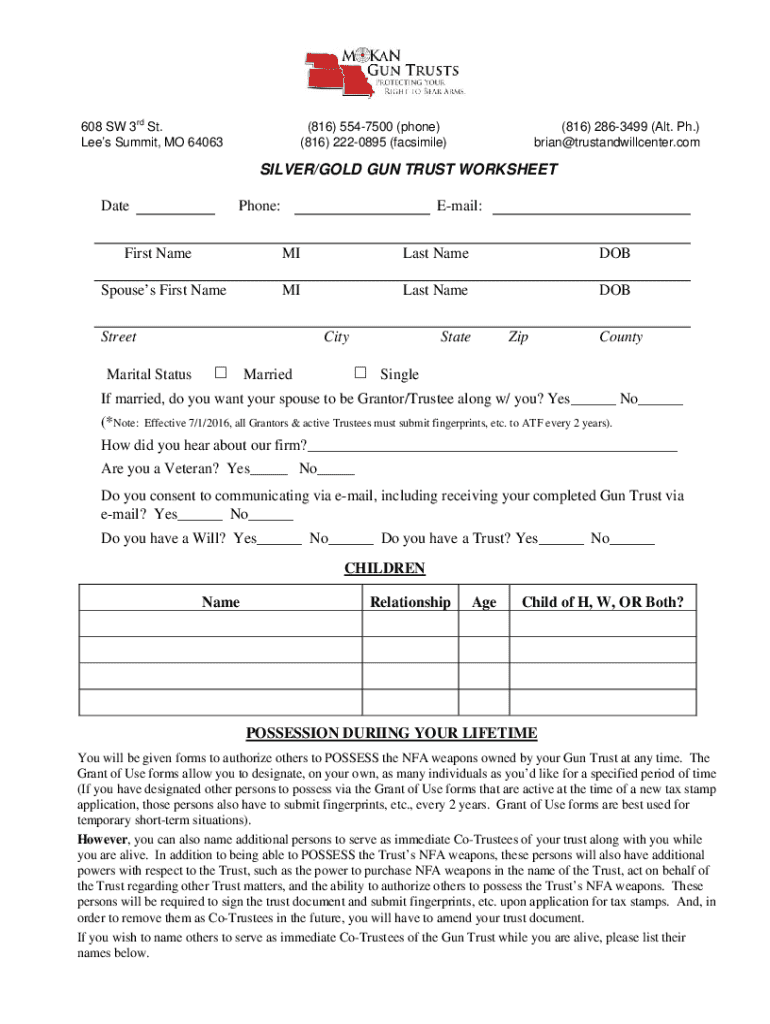 The utilization of a gun trust worksheet provides multiple advantages for prospective gun owners. First and foremost, it significantly streamlines the trust creation process by providing a structured format to follow. This organization not only avoids the common pitfalls associated with trust creation but also reduces the complexity often encountered when drafting legal documents.