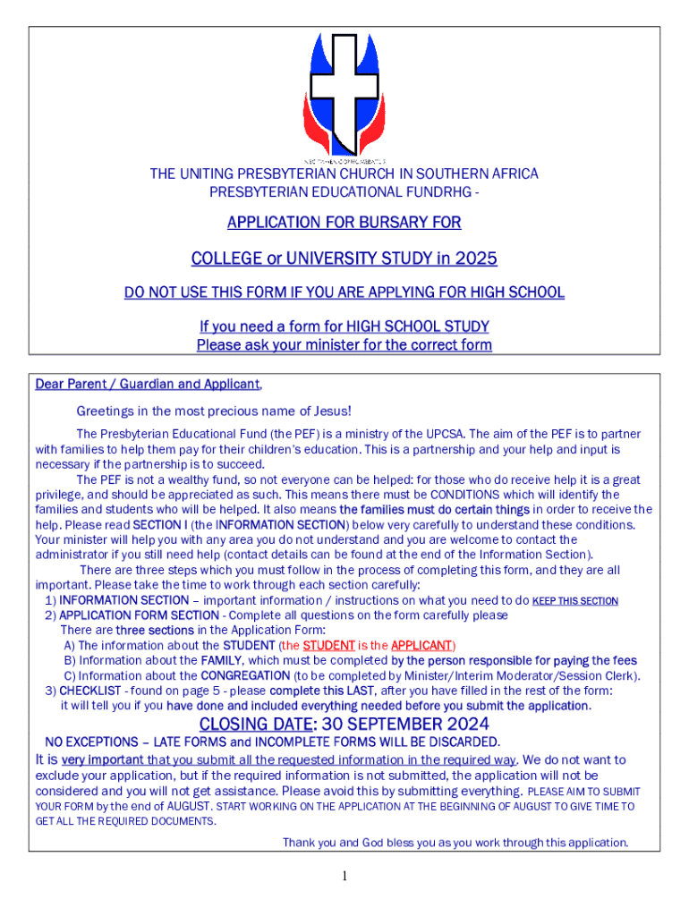 THE UNITING PRESBYTERIAN CHURCH IN SOUTHERN AFRICA PRESBYTERIAN EDUCATIONAL FUNDRHG APPLICATION FOR BURSARY FORCOLLEGE or UNIVERSITY STUDY in 2025 DO NOT USE THIS FORM IF YOU ARE APPLYING FOR HIGH SCHOOL If you need a form for HIGH SCHOOL STUDY Please ask your minister for the correct form Dear Parent / Guardian and Applicant, Greetings in the most precious name of Jesus! The Presbyterian Educational Fund (the PEF) is a ministry of the UPCSA. The aim of the PEF is to partner with families to...