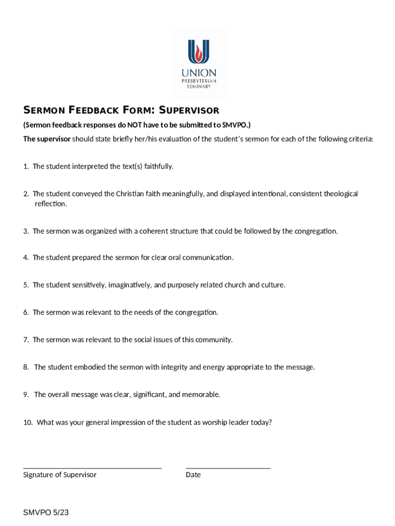 A sermon evaluation form is a structured tool designed to gather feedback about sermons from the congregation. Its primary purpose is to facilitate a systematic approach to feedback, enabling preachers to understand their strengths and areas for growth. The structured format offers both evaluative metrics and qualitative input, allowing for an extensive understanding of how a sermon was received.