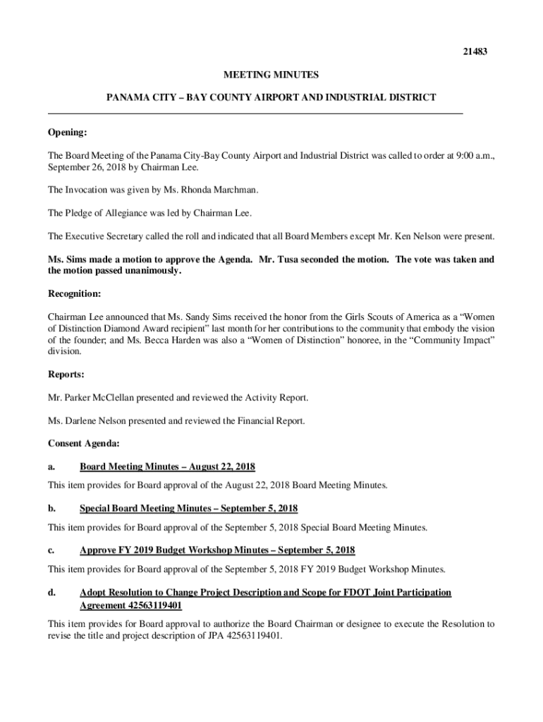 21483 MEETING MINUTES PANAMA CITY BAY COUNTY AIRPORT AND INDUSTRIAL DISTRICTOpening: The Board Meeting of the Panama CityBay County Airport and Industrial District was called to order at 9:00 a.m., September 26, 2018 by Chairman Lee. The Invocation was given by Ms. Rhonda Marchman. The Pledge of Allegiance was led by Chairman Lee. The Executive Secretary called the roll and indicated that all Board Members except Mr. Ken Nelson were present. Ms. Sims made a motion to approve the Agenda. Mr