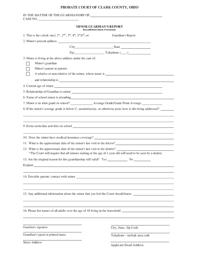 PROBATE COURT OF CLARK COUNTY, OHIO IN THE MATTER OF THE GUARDIANSHIP OF: CASE NO. ___ MINOR GUARDIAN\'S REPORT (Use additional sheets, if necessary)1. This is the (circle one): 1st, 2nd, 3rd, 4th,