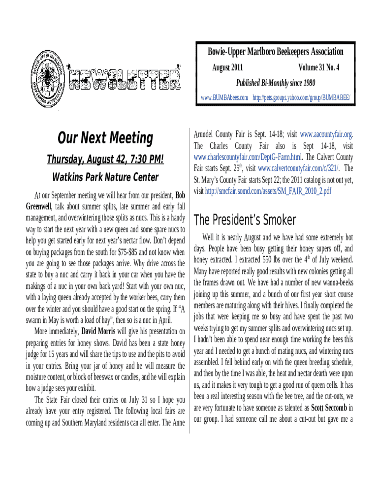 The BUMBA: The Bowie-Upper Marlboro Beekeepers is a writable document that should be submitted to the relevant address in order to provide certain information. It must be completed and signed, which is possible manually, or using a certain software like PDFfiller. This tool allows to complete any PDF or Word document directly in your browser, customize it depending on your purposes and put a legally-binding electronic signature. Once after completion, the user can send the BUMBA: The Bowie-Upper Marlboro Beekeepers to the appropriate individual, or multiple individuals via email or fax. The template is printable as well thanks to PDFfiller feature and options proposed for printing out adjustment. Both in digital and physical appearance, your form will have got neat and professional look. You can also turn it into a template for later, there's no need to create a new file again. All you need to do is to customize the ready template.