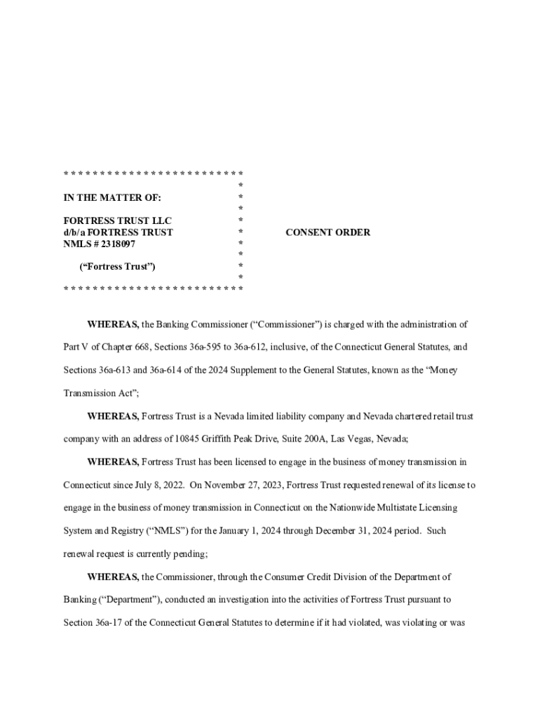 ************************* * IN THE MATTER OF: * * FORTRESS TRUST LLC * d/b/a FORTRESS TRUST * NMLS # 2318097 * * (Fortress Trust) * * *************************CONSENT ORDERWHEREAS, the Banking Commissioner (Commissioner) is charged with the administration of Part V of Chapter 668, Sections 36a595 to 36a612, inclusive, of the Connecticut General Statutes, and Sections 36a613 and 36a614 of the 2024 Supplement to the General Statutes, known as the Money Transmission Act; WHEREAS,