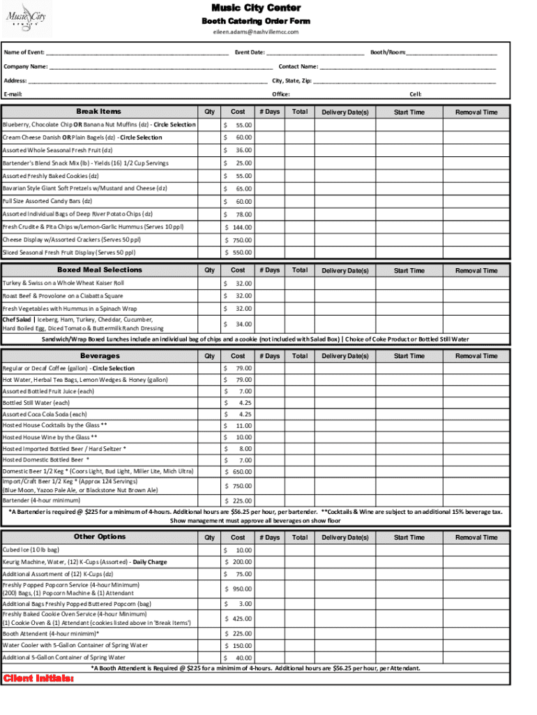 Music City Center Booth Catering Order Form eileen.adams@nashvillemcc.com Name of Event: ___ Event Date: ___ Booth/Room:___ Company Name: ___ Contact Name: ___ Address: ___ City, State, Zip: ___ Email:Office:Break