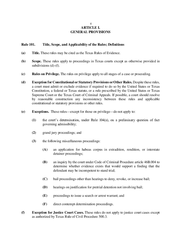 GENERAL PROVISIONSRule 101. Title, Scope, and Applicability of the Rules; Definitions(a)Title. These rules may be cited as the Texas Rules of Evidence.(b)Scope. These rules apply to proceedings