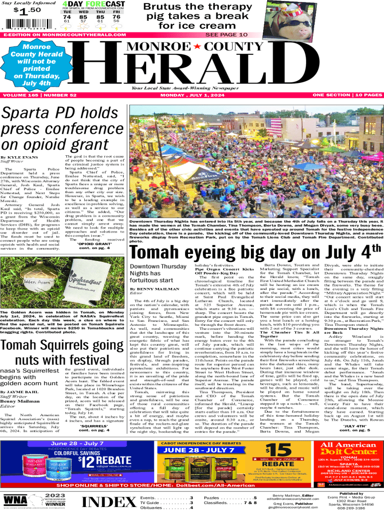 4DAY FORECASTStay Locally Informed1$.50Brutus the therapy pig takes a break for ice creamFOR SPARTA, WI FROM ACCUWEATHER.COMTUEWEDTHU748585615761FRI76 56HERALD SEE PAGE 10EEDITION ON MONROECOUNTYHERALD.COMMONROE COUNTYMonroe County Herald will not be printed on Thursday, July 4thYour Local State AwardWinning NewspaperVOLUME 165 | NUMBER 52ONE SECTION | 10 PAGESMONDAY , JULY 1, 2024Sparta PD holds press conference on opioid grant By KYLE EVANS Staff