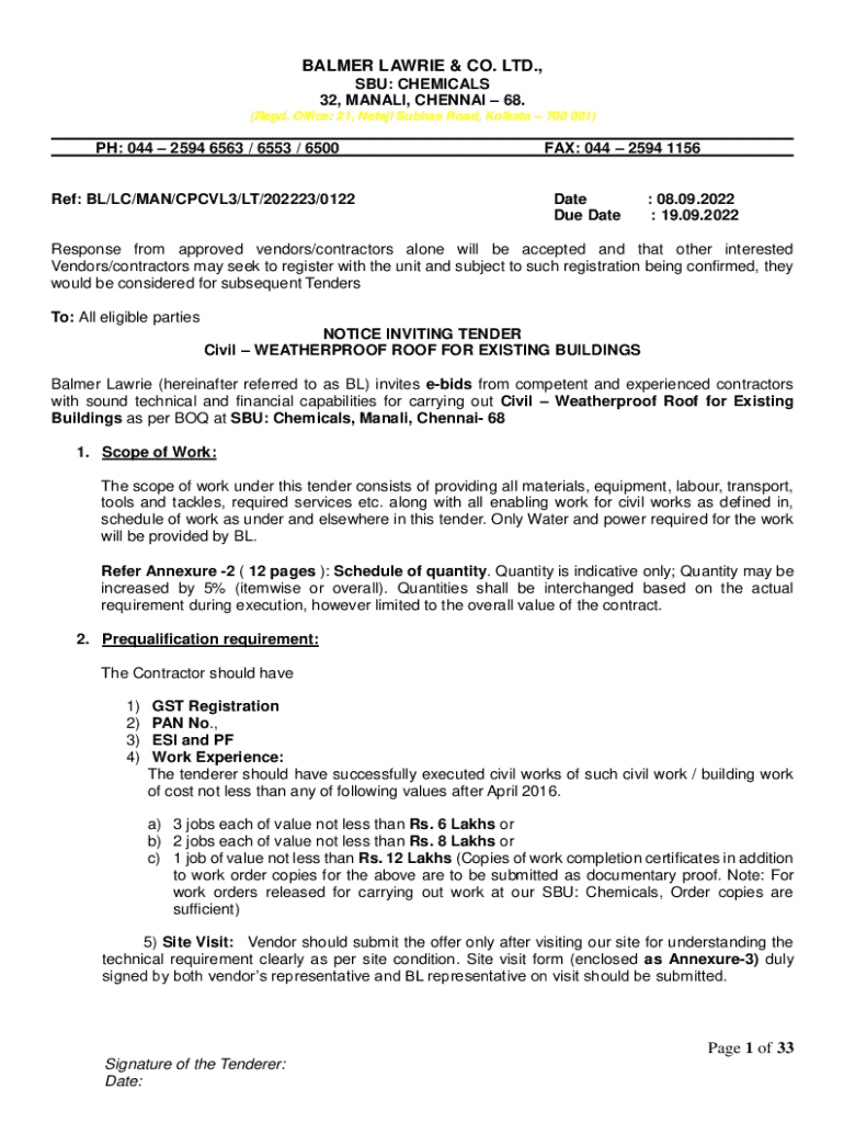 BALMER LAWRIE & CO. LTD., SBU: CHEMICALS 32, MANALI, CHENNAI 68. (Regd. Office: 21, Netaji Subhas Road, Kolkata 700 001)PH: 044 2594 6563 / 6553 / 6500Ref: BL/LC/MAN/CPCVL3/LT/202223/0122FAX: 044 2594 1156Date Due Date: 08.09.2022 : 19.09.2022Response from approved vendors/contractors alone will be accepted and that other interested Vendors/contractors may seek to register with the unit and subject to such registration being confirmed, they would be considered for subsequent