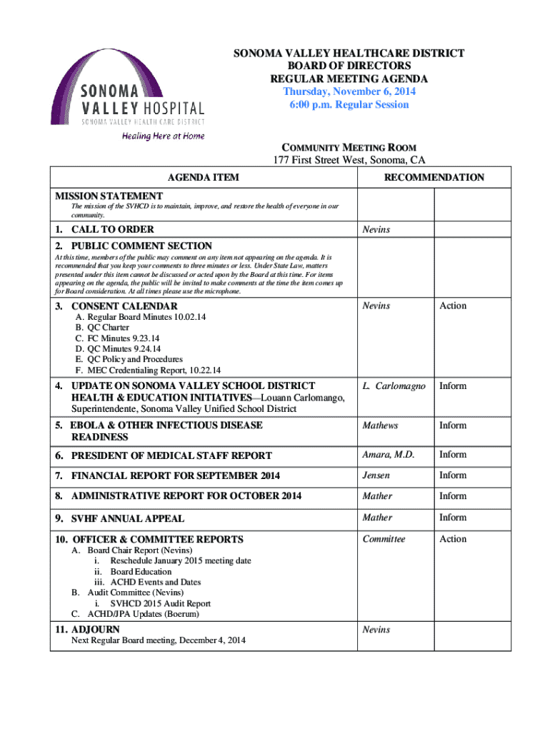 SONOMA VALLEY HEALTHCARE DISTRICT BOARD OF DIRECTORS REGULAR MEETING AGENDA Thursday, November 6, 2014 6:00 p.m. Regular SessionCOMMUNITY MEETING ROOM 177 First Street West, Sonoma, CA AGENDA ITEMRECOMMENDATIONMISSION STATEMENT The mission of the SVHCD is to maintain, improve, and restore the health of everyone in our community.1. CALL TO ORDERNevins2. PUBLIC COMMENT SECTION At this time, members of the public may comment on any item not appearing on the agenda. It is recommended that you...