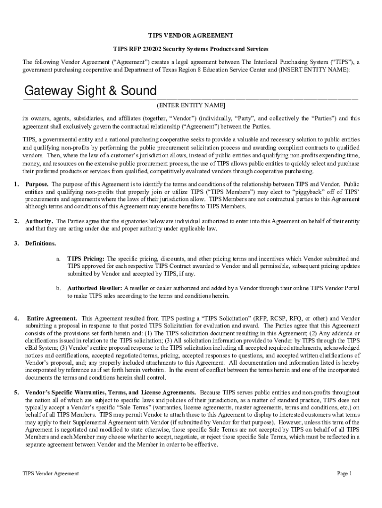 Get the free TIPS 230201 Vendor Agreement Sample Clauses