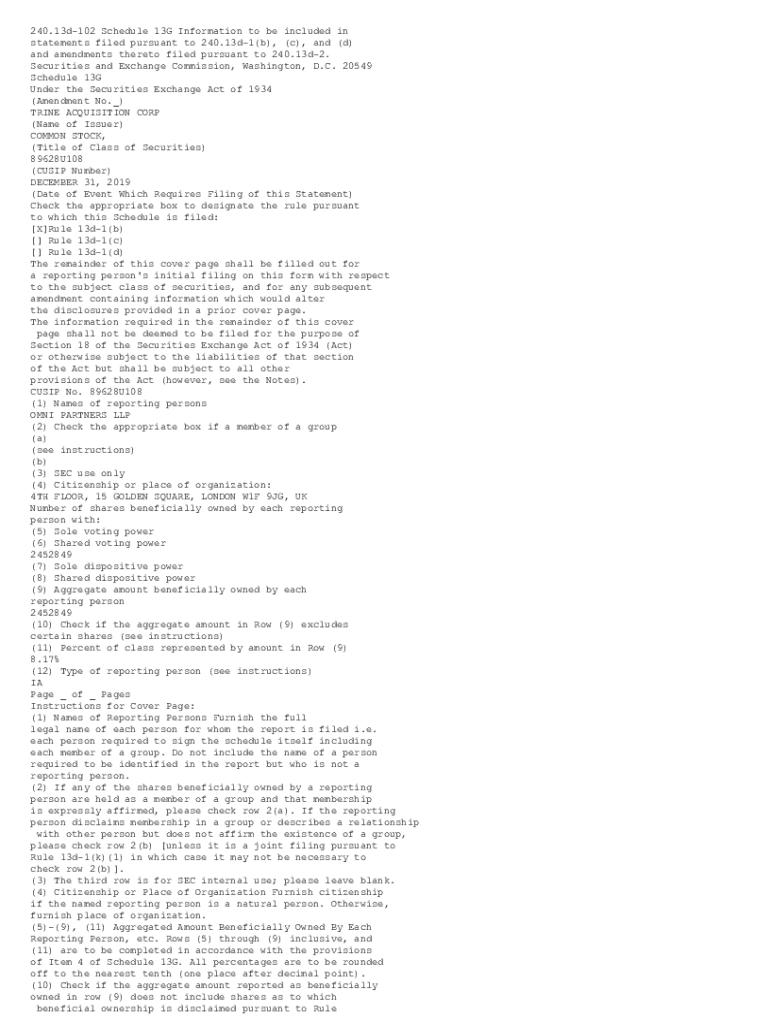 240.13d102 Schedule 13G Information to be included in statements filed pursuant to 240.13d1(b), (c), and (d) and amendments thereto filed pursuant to 240.13d2. Securities and Exchange Commission, Washington, D.C. 20549 Schedule 13G Under the Securities Exchange Act of 1934 (Amendment No._) TRINE ACQUISITION CORP (Name of Issuer) COMMON STOCK, (Title of Class of Securities) 89628U108 (CUSIP Number) DECEMBER 31, 2019 (Date of Event Which Requires Filing of this Statement) Check the appropriate box
