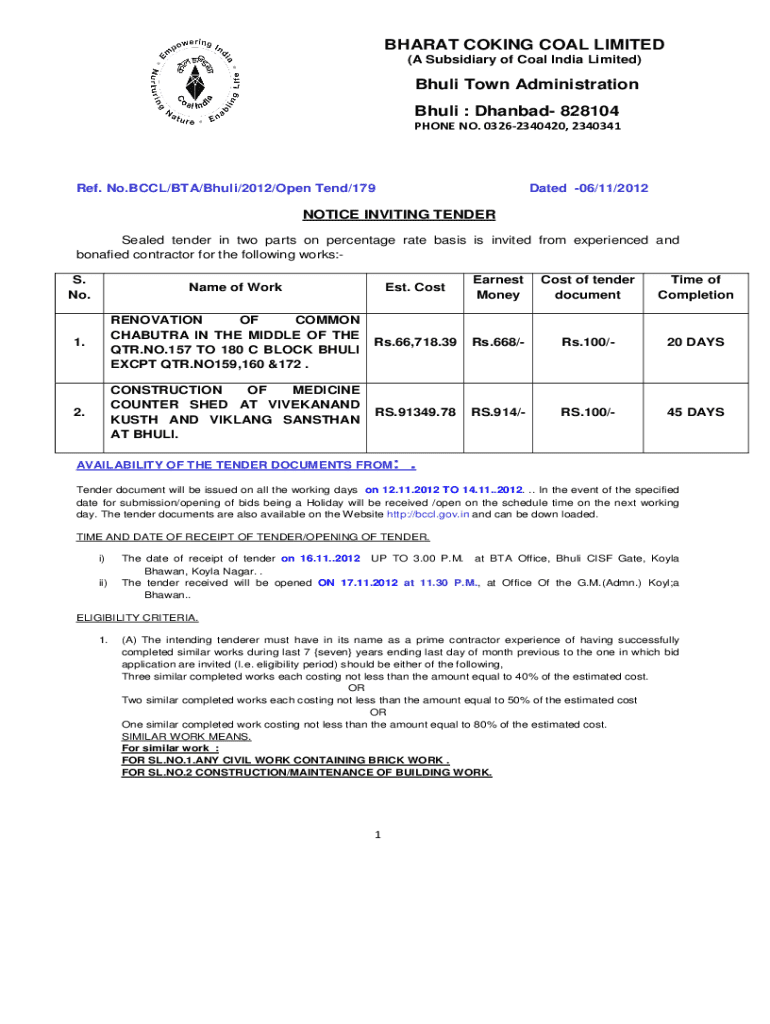 BHARAT COKING COAL LIMITED (A Subsidiary of Coal India Limited)Bhuli Town Administration Bhuli : Dhanbad 828104 PHONE NO. 03262340420, 2340341Ref. No.BCCL/BTA/Bhuli/2012/Open Tend/179Dated 06/11/2012NOTICE INVITING TENDER Sealed tender in two parts on percentage rate basis is invited from experienced and bonafied contractor for the following works:S. No.Earnest MoneyCost of tender documentTime of Completion1.RENOVATION OF COMMON CHABUTRA IN THE MIDDLE OF THE Rs.66,718.39 QTR
