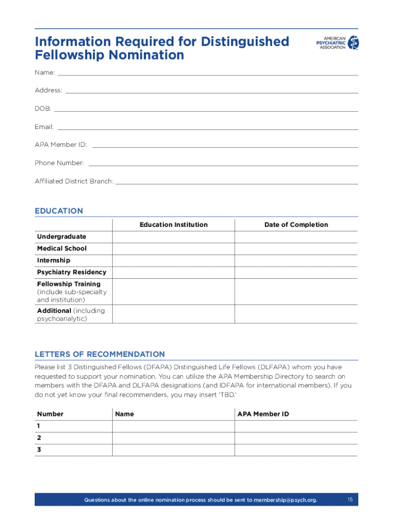 202425District Branch Guide to Distinguished Fellowship Questions about the online nomination process should be sent to membership@psych.org.1Table of Contents Introduction................................................................................................................................................................................... 3 Timeline..................................................................................................................................