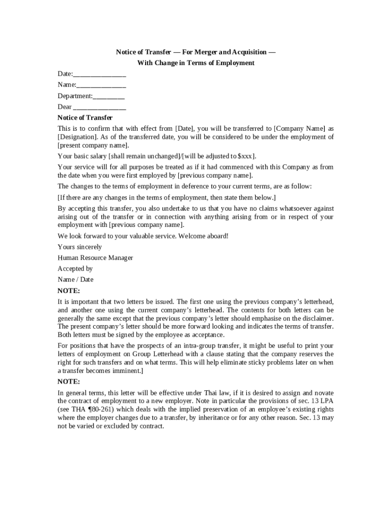 Notice of Transfer (For Merger and Acquisition word template: frequently asked questions