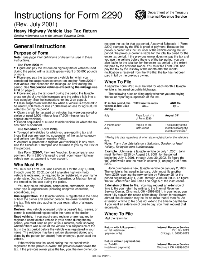 Department of the Treasury Internal Revenue ServiceInstructions for Form 2290 (Rev. July 2001) Heavy Highway Vehicle Use Tax Return Section references are to the Internal Revenue Code.General Instructions Purpose of Form Note: See page 7 for definitions of the terms used in these instructions. Use Form 2290 to: Figure and pay the tax due on highway motor vehicles used during the period with a taxable gross weight of 55,000 pounds or more. Figure and pay the tax due on a vehicle for which