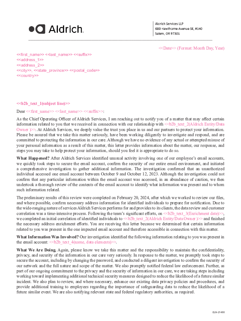 Get the free Notice of Data Event - Aldrich Services - MT