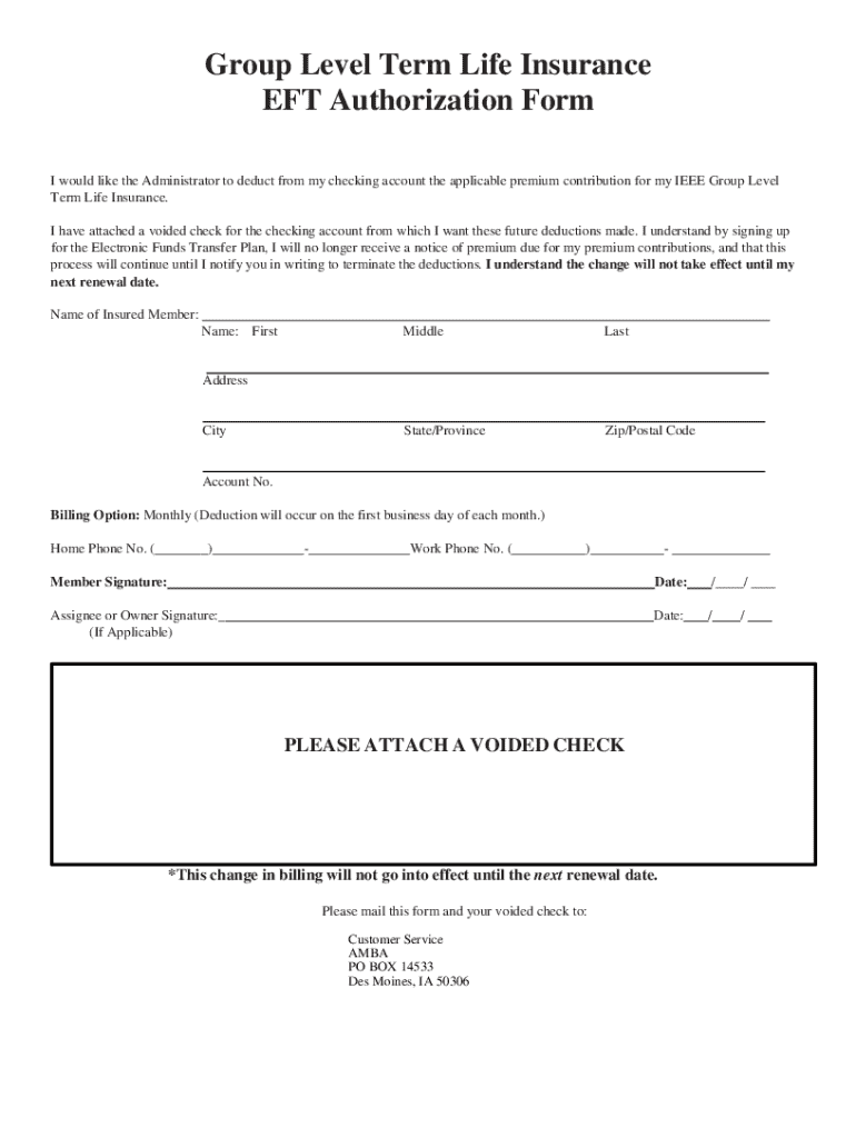 Get the free Group Level Term Life Insurance EFT Authorization Form - IEEE