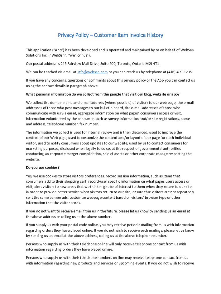 Privacy Policy Customer Item Invoice History This application (App) has been developed and is operated and maintained by or on behalf of WebSan Solutions Inc. (WebSan, we or us). Our postal address