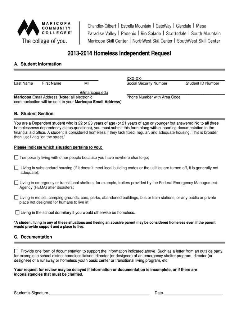 2013-2014 Homeless Independent Request A. Student Information Last Name First Name MI Maricopa.edu Maricopa Email Address (Note: all electronic communication will be sent to your Maricopa Email Address)