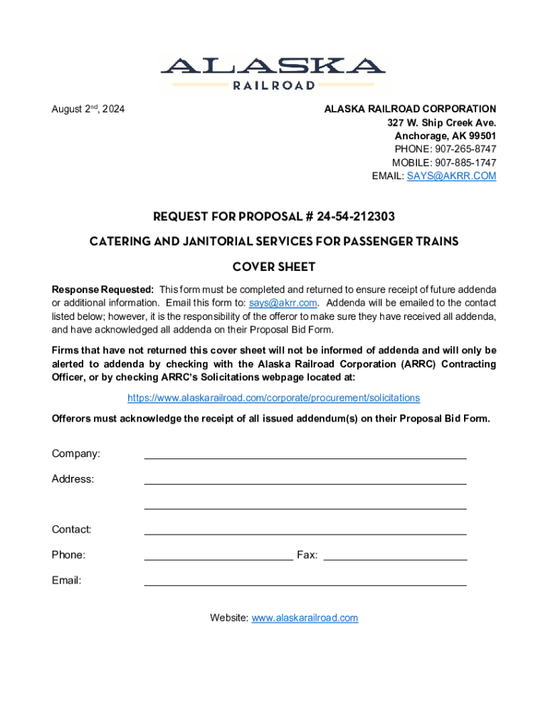 ALASKA RAILROAD CORPORATION 327 W. Ship Creek Ave. Anchorage, AK 99501 PHONE: 9072658747 MOBILE: 9078851747 EMAIL: SAYS@AKRR.COMAugust 2nd, 2024REQUEST FOR PROPOSAL # 2454212303 CATERING AND JANITORIAL SERVICES FOR PASSENGER TRAINS COVER SHEET Response Requested: This form must be completed and returned to ensure receipt of future addenda or additional information. Email this form to: says@akrr.com. Addenda will be emailed to the contact listed below; however, it is the responsibility of