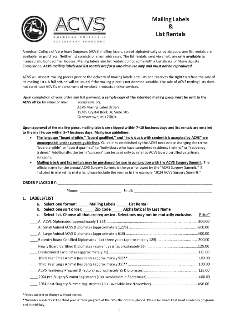 Get the free ACVS Mailing List Rentals and Labels Order Form and ...
