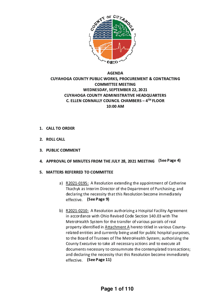 AGENDA CUYAHOGA COUNTY PUBLIC WORKS, PROCUREMENT & CONTRACTING COMMITTEE MEETING WEDNESDAY, SEPTEMBER 22, 2021 CUYAHOGA COUNTY ADMINISTRATIVE HEADQUARTERS C. ELLEN CONNALLY COUNCIL CHAMBERS 4TH FLOOR 10:00 AM1. CALL TO ORDER 2. ROLL CALL 3. PUBLIC COMMENT 4. APPROVAL OF MINUTES FROM THE JULY 28, 2021 MEETING (See Page 4) 5. MATTERS REFERRED TO COMMITTEE a) R20210195: A Resolution extending the appointment of Catherine Tkachyk as Interim Director of the Department of Purchasing; and declaring