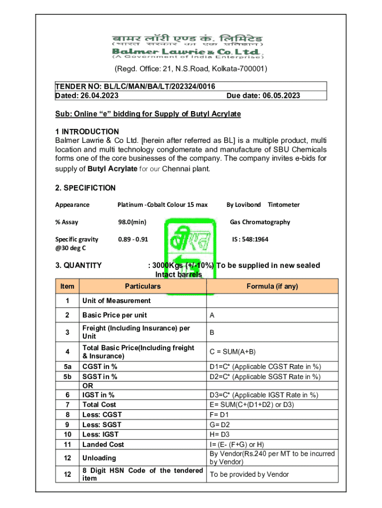 (Regd. Office: 21, N.S.Road, Kolkata700001) TENDER NO: BL/LC/MAN/BA/LT/202324/0016 Dated: 26.04.2023Due date: 06.05.2023Sub: Online e bidding for Supply of Butyl Acrylate 1 INTRODUCTION Balmer Lawrie & Co Ltd. [herein after referred as BL] is a multiple product, multi location and multi technology conglomerate and manufacture of SBU Chemicals forms one of the core businesses of the company. The company invites ebids for supply of Butyl Acrylate for our Chennai plant. 2. SPECIFICTION...