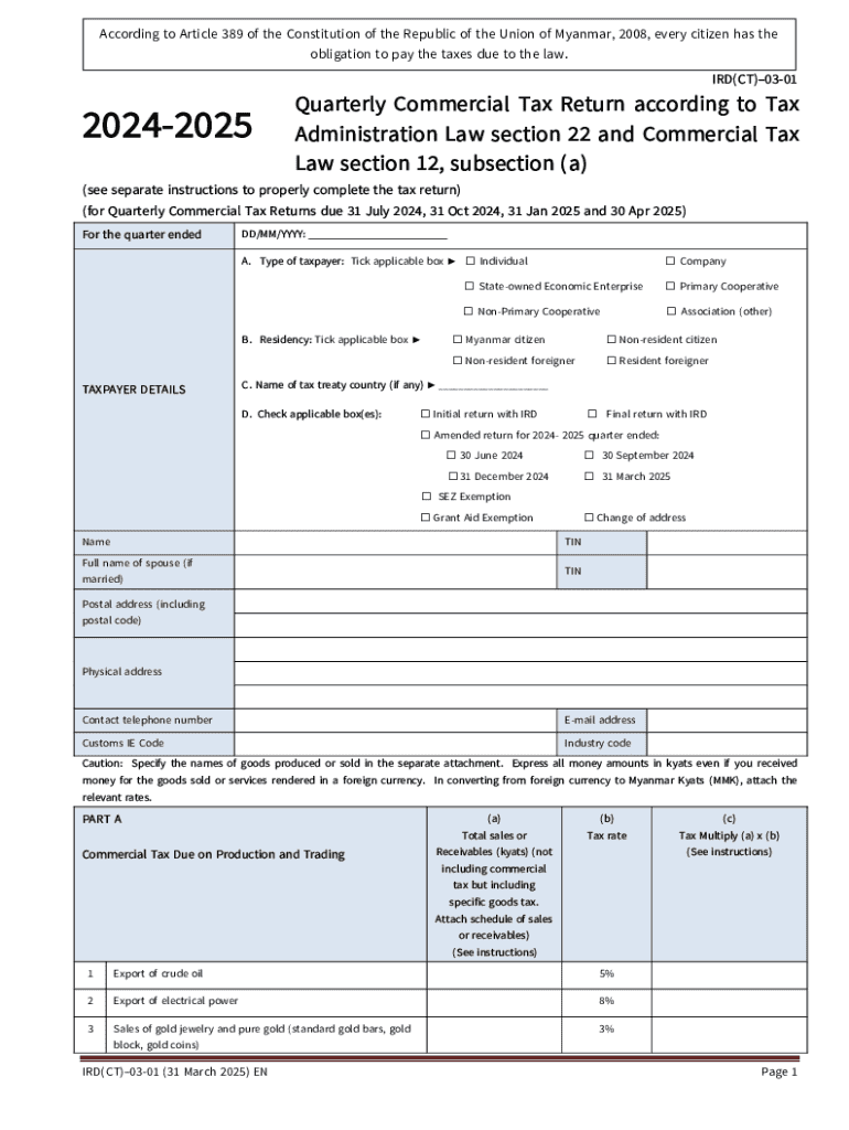 According to Article 389 of the Constitution of the Republic of the Union of Myanmar, 2008, every citizen has the obligation to pay the taxes due to the law. IRD(CT)030120242025Quarterly Commercial