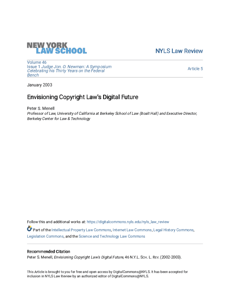 NYLS Law Review Volume 46 Issue 1 Judge Jon. O. Newman: A Symposium Celebrating his Thirty Years on the Federal BenchArticle 5January 2003Envisioning Copyright Law\'s Digital Future Peter S. Menell