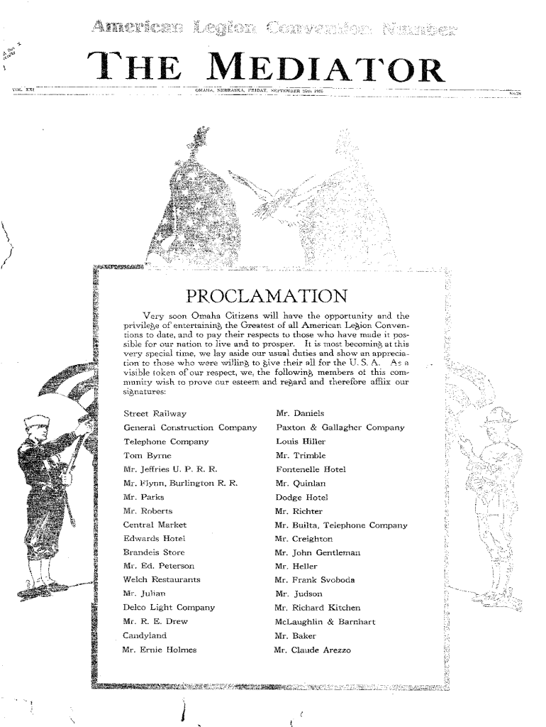 EDIA\'l\'OR../(PROCLAMATION Very soon Omaha Citizens will have the opportunity and the privilege of entertaining the Greatest of all American LeBion Conventions to date, and to pay their respects to those who have made it possible for our nation to live and to prosper. It is most becoming at this very special time, we lay aside our usual duties and show an appreciation to those who were willing to Bive their all for the U. S. A. As a visible token of our respect, we, the following members